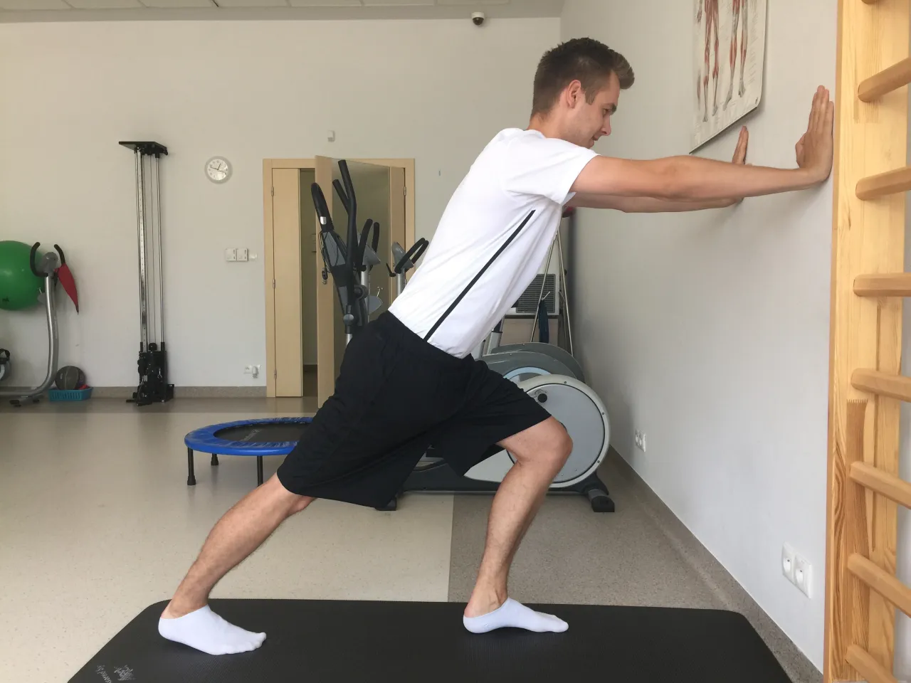 - Rozciąganie łydek (wykrok przy ścianie, z prostym i ugiętym kolanem): 30 sekund na każdą nogę (po 15 s na każdy wariant).
